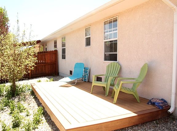 Small side deckPrivate back deckVaulted ceilingSmall garden area