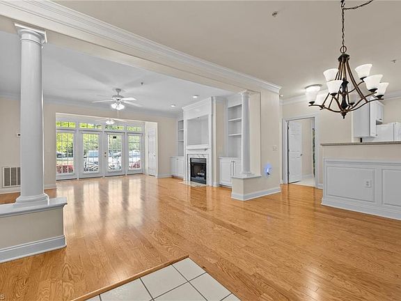 Beautifully designed FIRST-floor 2-bedroom, 2-full bathroom condo in a peaceful 55+ community, offering accessibility, low-maintenance living, and modern updates. This bright home features hardwood floors, a gas log fireplace, and built-ins. The split bedroom layout includes a spacious primary suite with walk-in closet and access to a full bathroom with double vanities and a walk-in shower. The second bedroom is near another full bathroom, recently updated with a curbless shower for added accessibility. The tiled kitchen offers solid surface countertops and ample cabinet space. A large laundry room includes shelving, cabinetry, and countertop space. The 2024 water heater adds peace of mind. Enter from your assigned parking space or through a secure hallway. The clubhouse features a kitchen, fitness room, card room, gathering spaces, and patio with grills. Convenient to grocery stores, restaurants, medical offices, highways, and Topgolf. Comfort and convenience for active living.
