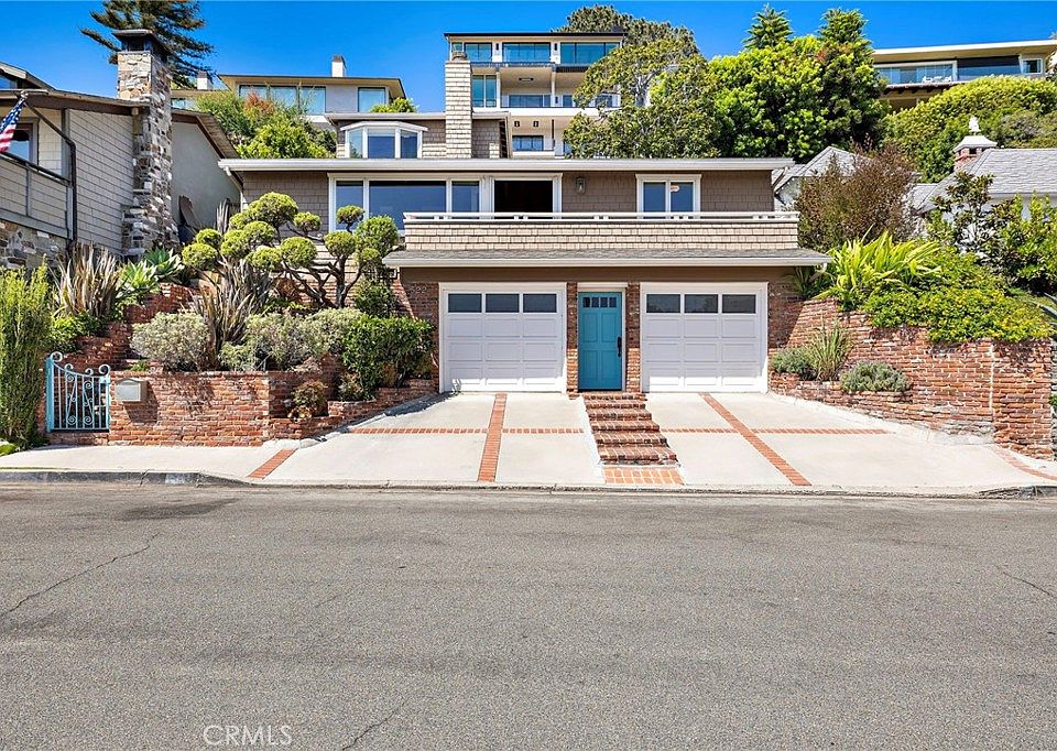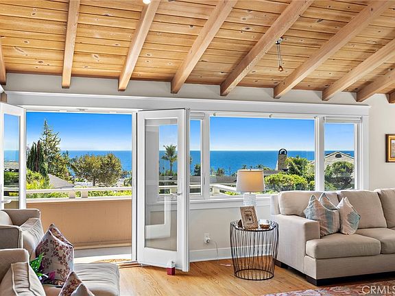 Nestled in the coveted Tree Streets of North Laguna, this beautifully appointed residence offers sweeping ocean and Catalina Island views from nearly every angle. With three en suite bedrooms and a layout designed for seamless indoor-outdoor living, the home blends classic charm with elevated coastal style. The main living room is warm and inviting, featuring soaring wood-beamed ceilings, oak flooring, a floor-to-ceiling brick fireplace, and oversized windows that frame the breathtaking views. Just off the living room, an expansive balcony provides the perfect setting for sunset watching or morning coffee by the sea. Open to the living space, the kitchen and dining area are designed with both style and function in mind—featuring high-end stainless appliances including a Viking stove, granite countertops with a breakfast bar, a second brick fireplace, and vaulted ceilings with a skylight providing abundant natural light. French doors from the dining area lead to a terraced garden oasis complete with multiple sitting areas, an upper deck with incredible views, and mature landscaping that includes lemon, orange, olive, and magnolia trees. All three bedrooms are en suite, with beautifully finished bathrooms. The primary suite stands out with its ocean views that make every morning feel like a retreat. Located in sought-after North Laguna, just blocks from world-renowned beaches, art galleries, upscale dining, and boutique shops, this home offers the best of Laguna Beach living in one of its most desirable neighborhoods.