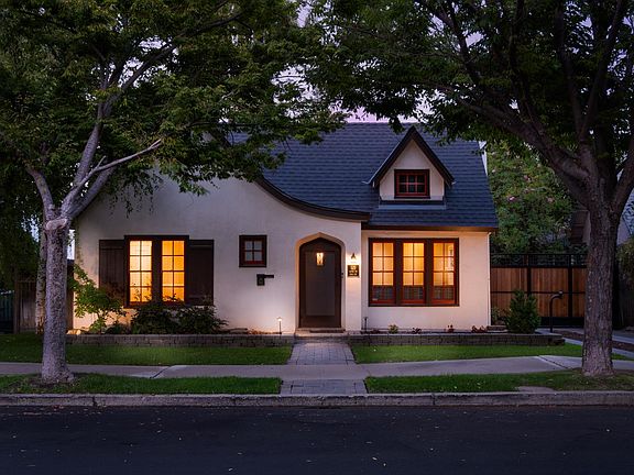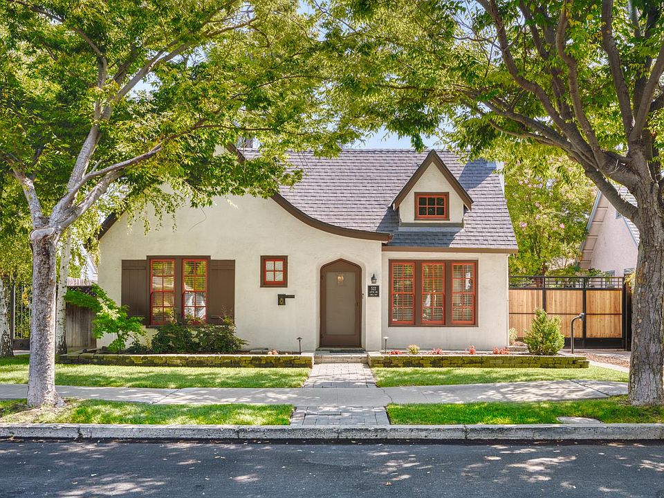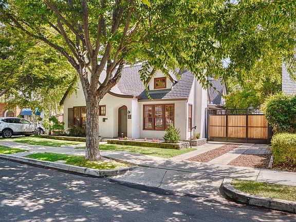 Once upon a Lottie Avenue Built in 1927, this storybook Tudor with Art Deco notes reads like a favorite chapter of Central Modesto. A graceful pointed arch door, dormer window, and warm twilight glow set the tone; inside, original hardwoods, coved ceilings, and arched pass throughs keep the vintage soul front and center. The living room gathers at a painted masonry fireplace; meals linger in the cozy breakfast nook or unfold in the formal dining room. The kitchen blends period charm with ease, white cabinets, honed quartz, stainless appliances and the laundry opens to the patio for everyday convenience. Need flex space? A refreshed partial basement (newer flooring, staircase, paint) suits wine storage/cellar, den, or possible bedroom. Outdoors, life flows through multi lite French doors to a leafy side courtyard, along the long electric security gated drive to a detached garage that functions best as a workshop, and across a sun splashed back lawn framed by redwood & cedar, plus a Seville orange for seasonal color. Thoughtful stewardship keeps the magic effortless: new electrical throughout, new roofs on the home & garage (Feb 2025), and plumbing updates. All on beloved, tree lined Lottie in the Graceada Park area near Enslen Elementary. The next chapter is yours.
