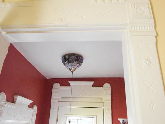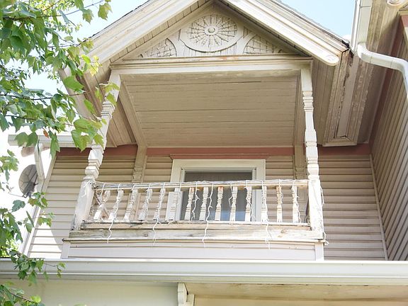 Enter the home through the covered front porch with gingerbread accents into the foyer with stained glass. From there you will fond the cozy front room with high ceilings, beautiful ornate woodwork that carries through the double doors into the Living room that was once used for formal dining with it's built-in cabinet. Kitchen is large with lots of cabinets and counters and subway tile backsplash. Appliances include new dishwasher, fridge, and 5 burner gas stove. Around the corner is more storage and a huge walk-in pantry. The back room is a large family room. The laundry is on the main level with stack washer and dryer and laundry sink and more cabinets for storage, The primary bedroom is on the main level and attaches to a full bath. Upstairs are 4 more large bedrooms and a large bathroom. The home is boiler hot water heat. There is air conditioning on the main level. Outside is a deck and a large yard with storage shed.