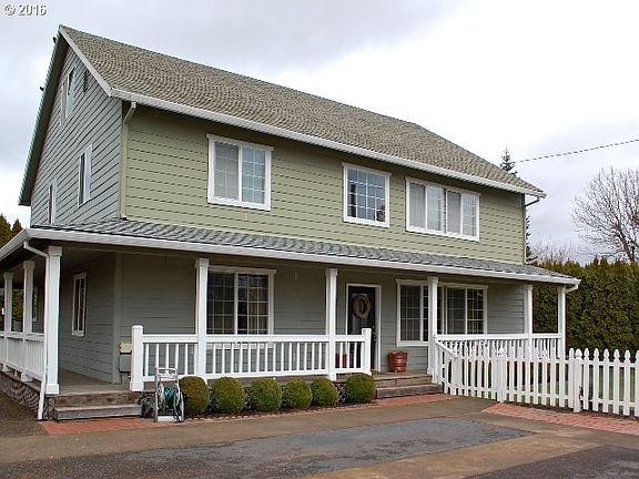 Beautiful 1910 farm home, 9' ceilings, maple wood floors, picturesque windows bringing in natural light. Doors & wood floors are from Mt. Angel Catholic School adding to the charm and history of the home. Office on main w/built-ins. 4b/2.5 bath, finished attic perfect as a family rec room. Side-wrap front porch completes the farm home charm. New roof, pier pads & new sewer line.