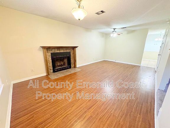 Conveniently situated near two military bases and a medical center in Fort Walton Beach, this end unit townhome offers a comfortable living experience. The spacious living room features a wood burning fireplace, a storage closet, laminate flooring, and a half bathroom. The fully equipped kitchen boasts white cabinets, matching appliances, and tile flooring.