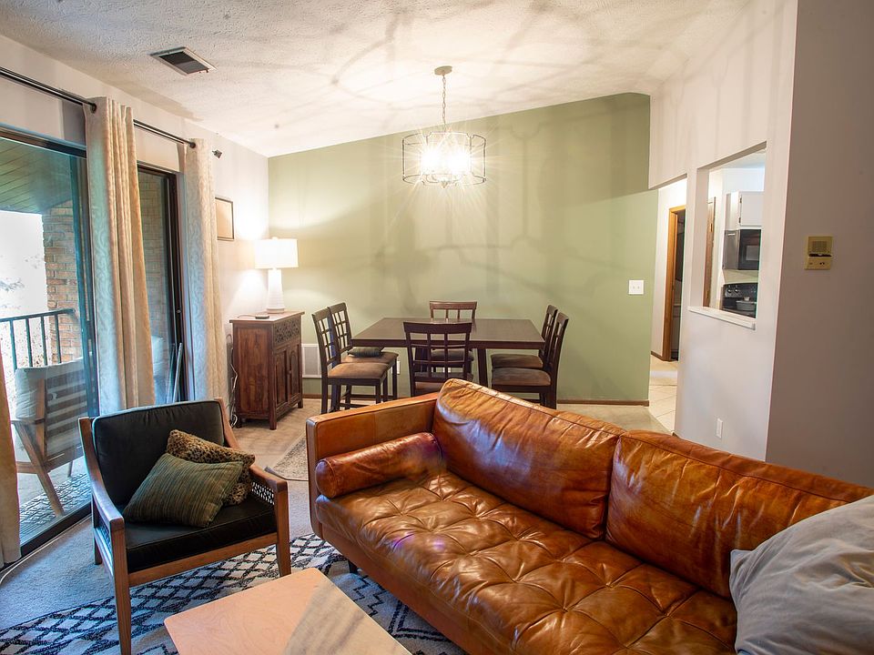 The unit features vaulted ceilings and an abundance of natural light, with sliding glass doors opening to a private balcony that overlooks pine trees and peaceful greenery. The layout is comfortable, with generously sized closets and a dedicated laundry area inside the unit.