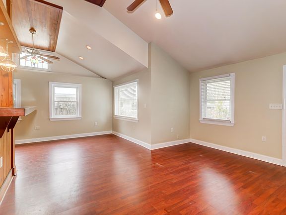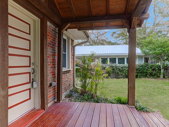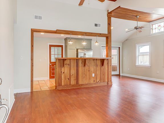 Charm with vaulted ceiling with some wood ceilings, lots of light. The open plan with living, dining areas plus raised bar with sealed heart pine island, custom cabinets, stainless backsplash, stainless appliances with gas range. beautiful stained glass window with wood details. the terra coda floor in kitchen and laminate in living areas. Private yard with oversized deck with built-in fire pit, pagoda for sitting, built-in planters and out side shower. Fenced yard, screened porch that wraps. Large laundry room plus pantry. 3 Br's, linen closet in hall. Roof is 2018 and windows are newer.Lots of potential!