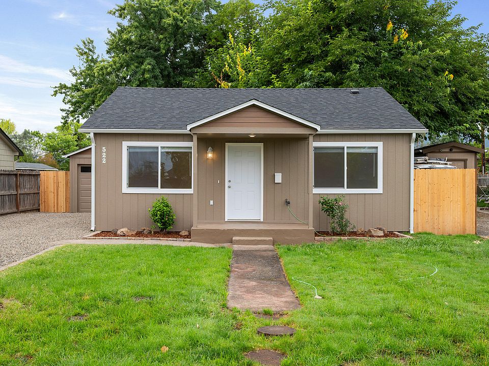Just like new!! This sweet 2-bedroom, 1-bath home has been rebuilt with style. Literally everything is new—electrical, plumbing, HVAC, water heater, drywall, siding, laminate flooring, light fixtures, vinyl windows, cabinets, and stunning granite countertops. The kitchen includes an eating area and blends both function and style. Outside, you'll love the sweet front porch, spacious back patio, detached garage with laundry hookups, lots of parking, and a newly graveled driveway. The fully fenced yard offers privacy and room to enjoy. With brand-new systems and stylish finishes throughout, this home is truly turnkey—grab it while you can!
