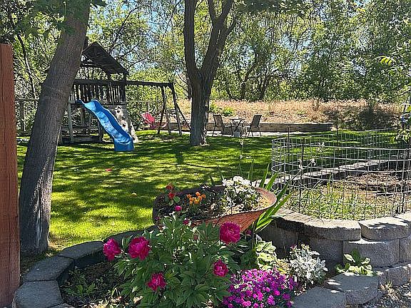 Mature HUGE yard with two garden beds, TONS of perennials, fire pit, underground automatic sprinklers. Right on the dike for river access.