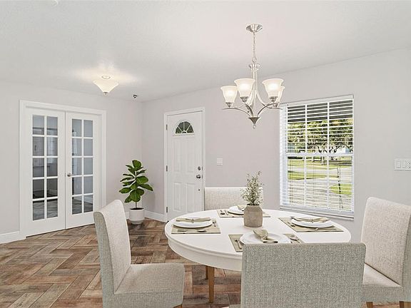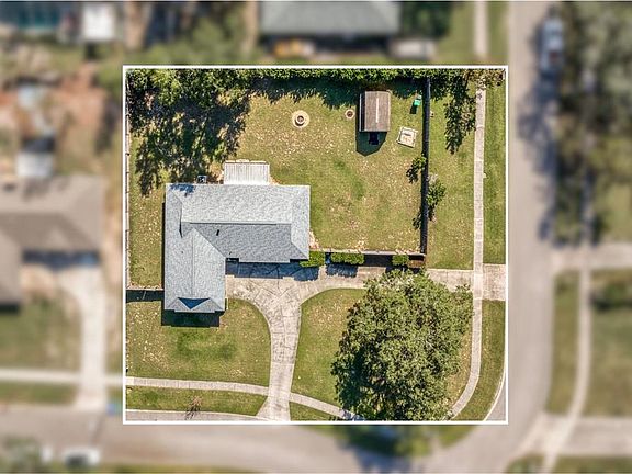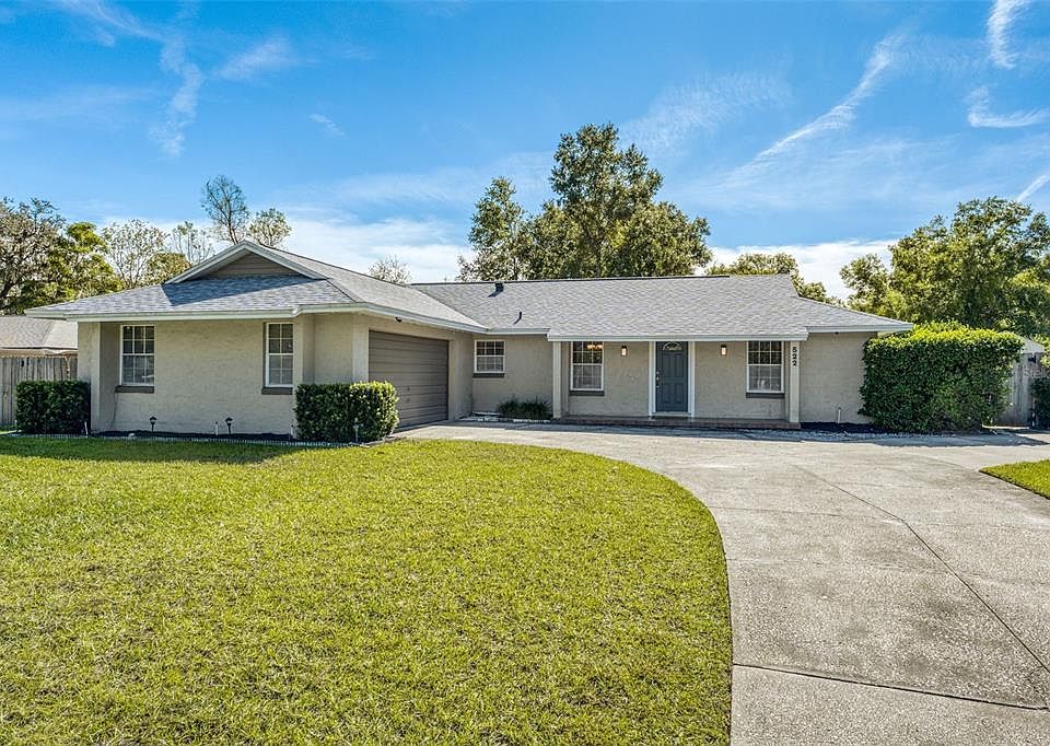 One or more photo(s) has been virtually staged. This abode sets itself apart in many ways! From the outside with nearly a half-acre corner lot with circular driveway, no HOA, fully fenced backyard, and even sturdy detached storage building to the inside, where it truly shines. So many updates in this renovated 4 bed, 2 bath open plan layout with luxury herringbone pattern wood-look tile floors (no carpeting). The kitchen is the star with the large granite topped center island/breakfast bar, solid wood cabinets with soft close drawers, under cabinet lighting, beautiful subway tile backsplash, and vented range hood along with stainless steel appliances. Recessed lighting and NO popcorn ceilings truly elevate this home. The sizable living and dining space opens-up to the outside through the double French doors leading to the covered and screened-in tile porch, perfect for al-fresco dining. With a split bedroom plan, the spacious primary with elegant en-suite offers a large walk-in tiled shower with glass surround, granite topped vanity, and expansive walk-in closet. Two other bedrooms and a fully renovated hall bath with tub/shower is on the other side of the home. The 4th bedroom with closet is off the foyer and could be a perfect office or den. Updates include NEW roof 2022; NEW AC compressor 2024; NEW garage door springs, hardware and Chamberlain MyQ remote opener 2025; totally replumbed w/ PEX 2015; SMART home Ecobe thermostat, SMART Govee lighting system. Truly a move-in ready house for you to call your new home.