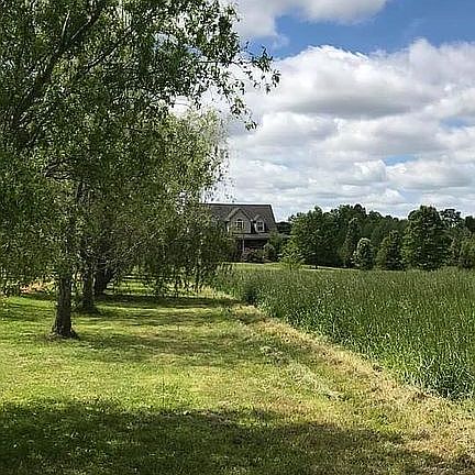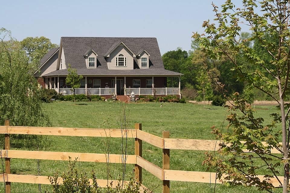 Beautiful Farmhouse style brick home with large wrap around porch sitting in the middle of 16 acres of land . Has a quaint little cottage. workshop and small barn on property