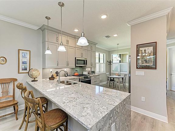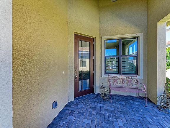 Just listed ! Fabulous "Lido" model located in the premier 55+ amenity packed community of Cresswind, a true Lakewood Ranch gem. This home is simply gorgeous and allows for beautiful natural light to stream in. This smart floor plan features 2 nice sized bedrooms AND a den/office.. the beautiful chef's kitchen comes with thick quartz countertops, Upgraded GE appliances, soft close drawers, a natural gas stove with double ovens, pendant lighting, contemporary glass tile backspash and soft grey cabinets that reach the ceiling. The quartz waterfall countertop upgrade, easy access pantry and the plantation shutters are an added bonus to this smartly designed space. Move in ready ! Quality finishes at every turn.. nice fans, window treatments and light fixtures are already in place along with an upgraded 220 V outlet in the extended garage to charge your vehicle. You will find a distinctive curb appeal here with an extensive use of brick pavers, a stunning leaded glass front door, impact windows,brushed nickel door hardware and lush tropical landscaping. Screened in lanai and a berm homesite allow for privacy and a large pet friendly yard. Cresswind Lakewood Ranch by Kolter Homes is a gated, active adult village located in sunny Lakewood Ranch Florida, the #1 multi-generational community in the nation. Cresswind features a community vibe and homes designed for today's active adults, an award-winning lifestyle program, resident-only amenities and wide walkways. This pet-friendly community features a lakeside clubhouse overseen by a full-time lifestyle director with multi-purpose event and social spaces, Cresswind SmartFIT Training Center powered by EGYM, yoga studio, art studio with ceramics, game rooms, and various optional social clubs. Outdoor amenities include 6 pickleball courts & 2 tennis courts, 2 bocce courts, a popular dog park, resistance & resort-style pools, a spa, sundeck, event plaza with numerous food trucks and more. The reasonable monthly fee includes yard maintenance, mowing and trimming, irrigation, cable and internet. This is a fantastic opportunity and we look forward to your showing.