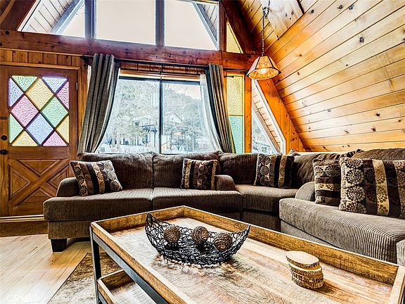 Classic A-frame with a fresh balance of modern fare and rustic charm on large lot. Home is turn-key with gorgeous views of the mountain ridge from both the front and backyard. Vaulted living room ceilings, with tons of natural light. Wood-burning fireplace and private sun-room off of the primary-suite where you can enjoy your coffee in the morning as you look out to the beautiful mountain skyline. Underneath the home there is also a basement/potential value-add opportunity that could be converted into a game room or wine cellar. Home also has not one, but two decks to take in the fresh mountain air, including a second 580 square foot redwood entertainment deck. Backyard is fully fenced-in and very private (no neighbors directly behind the home). Home is also level-entry which is rare in the mountains and has a large driveway + designated parking garage, where the washer and dryer are also located. Gorgeous trees and flowers during the summer. This home is simply special. There is nothing on market with the sophistication and charm this home features and at this price-point. LA (1.5 hrs) San Diego (2 hrs). 7 minutes from town, 15 mins from Ski Resort Mountain High.