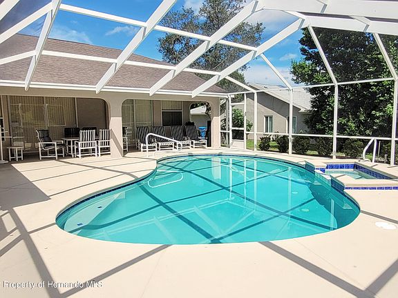 Golf course home with private pool on a beautiful third acre lot in Oak Hills community in Spring Hill! Double entry doors lead into the foyer and living area with view to pool. Light and bright home with open floor plan that includes living and dining areas plus breakfast nook. Spacious rooms and layout with cathedral ceiling and architectural details. You can access the screen-enclosed pool area from the living area as well as master bedroom. Tile flooring in living and all wet areas, carpet in bedrooms. Large kitchen features granite counters, breakfast bar and adjoining breakfast nook overlooking the pool area. Adjacent to the kitchen is the laundry room with large closet that can serve as pantry or other storage. The spacious master bedroom features two walk-in closets, and the master bath has dual vanities and a walk-in shower. Three generously sized guest bedrooms and two additional bath rooms are located on the opposite side of the home. All guest bedrooms have ample closet space, two have large walk-in closets. Sliding glass doors lead out onto the spacious pool deck and covered lanai that offers lots of room for relaxing and entertaining. The sparkling pool with spa is heated for year-round enjoyment. Relax and enjoy peaceful backyard and golf course views from your spacious pool area. No HOA. Home has been used as vacation/second home, furnishings available. Close to shopping, schools, dining, and recreational amenities including Pine Island Beach, public boat ramps, library, and more. Easy commute to Tampa Bay area via Suncoast Parkway.