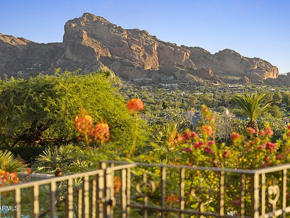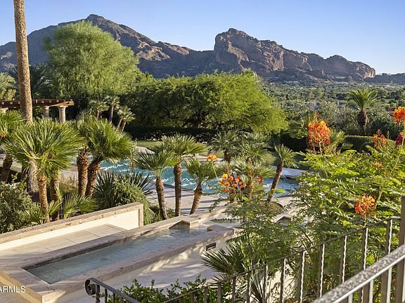 WITH VIEWS of FULL CAMELBACK MOUNTAIN, DRAMATIC PHX CITY LIGHTS, and a stone's throw from PARADISE VALLEY COUNTRY CLUB this timeless 5bed, 6.5bth Santa Barbara-style estate at 5221 E Arroyo Rd is on ONE OF THE MOST COVETED STREETS in PV. Set gently on the side of Mummy Mtn, the property features a large deep backyard with expansive lawns seldom found on hillside properties. A vast 145ft long patio spanning the back of this single-level main house is a fabulous place to sit and enjoy the views and grounds! There's also a 1,125 sqft multi-purpose guest house w/a full kitchen, laundry, bedrm + living rm which sits below the main residence and opens directly to the grounds and impressive pool that can also function as an entertainment space. The property offers 9,376 sf of refined living... A mesquite-lined drive leads to warm, light-filled interiors with wood-coffered ceilings, multiple fireplaces, a paneled library with bar and wine cellar, a great room, dining room, a gourmet kitchen, family room, office with full bath and 5 ensuite bedrooms including the spacious primary suite. The elegant pool, spa, lawns, citrus orchard, bright flowers, and cascading fountain create a private, resort-like escape.