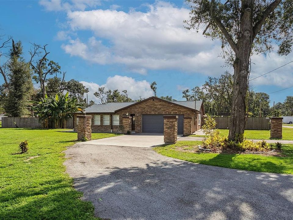 One or more photo(s) has been virtually staged. Don't miss out on this Gorgeous newly renovated, updated 4 bedroom, 3 bath. WOW.. Two Primary Bedrooms and a NEW ROOF 2025, new 200 AMP upgraded electrical panel and breakers, new kitchen and more. This stunning and entertaining pool home at just under an acre with large beautiful trees, sits quietly and beautifully with NO HOA fees/restrictions and endless entertainment possibilities. Extended driveway with lots of clean parking. Get Ready! Let's start with wall to wall tile throughout the entire living area of the home. This home boasts two primary bedrooms with full bathrooms, two additional bedrooms and a large bonus room for a pool table, office or game room. Oversized two car garage. The main high ceiling primary bedroom is a large suite with double entry, large walk in closet with organizing design, your own wet bar with cabinets, large bathroom with a gorgeous custom double sink vanity and very large shower with additional closet inside the bathroom and it's very own a/c unit for this suite, not to mention the double glass framed doors leading out onto the pool lanai. Upgraded beautiful bathrooms throughout. Beautiful great room connecting to an exceptional kitchen with all new cabinets, large cooking and dining island all covered with quartz countertops and a window overlooking pool and back yard entertainment. From the dining area leading out of the huge great room are double glass framed doors onto the screened pool Lanai featuring stone pavers, large outdoor grilling and full sink area, large granite counter tops with granite top high bar for the distance and entertainment area. Additional lounge and entertainment area outside of the lanai with stone pavers continued under a large pergola. All still within a private large back yard. Oversized shed offers plenty of storage area. Also has a stone paver pad ready for your travel trailer or small RV. Let's do this!