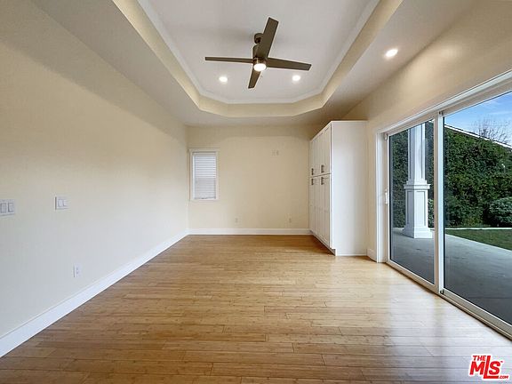 Welcome to this charming 4-bedroom, 5-bathroom home, a well-appointed beauty in the coveted William Mellenthin Mid-Century Ranch. Nestled on a cul-de-sac in the North Hidden Woods enclave of Sherman Oaks, this spacious home offers 3,100 square feet of living space on a 5,029 square-foot lot. Step into the inviting 2-story foyer, leading to a cozy living room with a welcoming fireplace. The expansive formal dining room is perfect for entertaining and can be extended further for larger gatherings. The gourmet kitchen is a chef's dream, featuring expansive quartz counters, a center island with bar seating, and top-of-the-line stainless steel appliances, including double convection ovens, two dishwashers, two microwaves, two sinks, and a French door refrigerator/freezer. Rich bamboo flooring, high ceilings, and abundant recessed lighting highlight the living areas and bedrooms. The main suite boasts a walk-in closet, a roomy dressing area, a spa tub, and a separate shower. To top it all off, enjoy relaxing on the private balcony.
