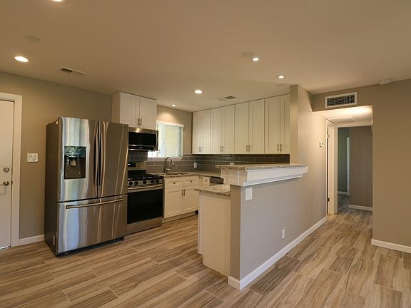 Inviting poolRemodeled bathroomBbq areaWhite shaker cabinetsGranite counter topsOpen kitchen designNew ceramic flooring