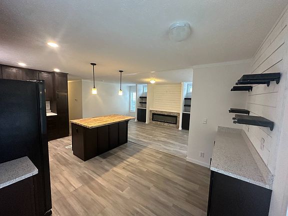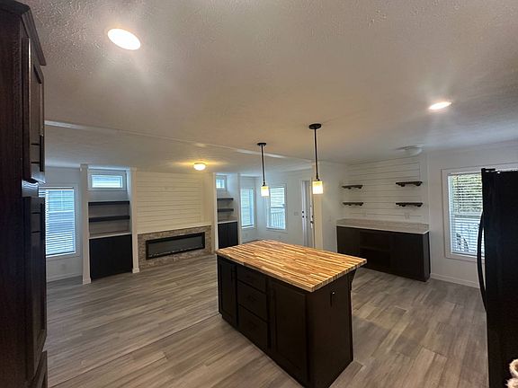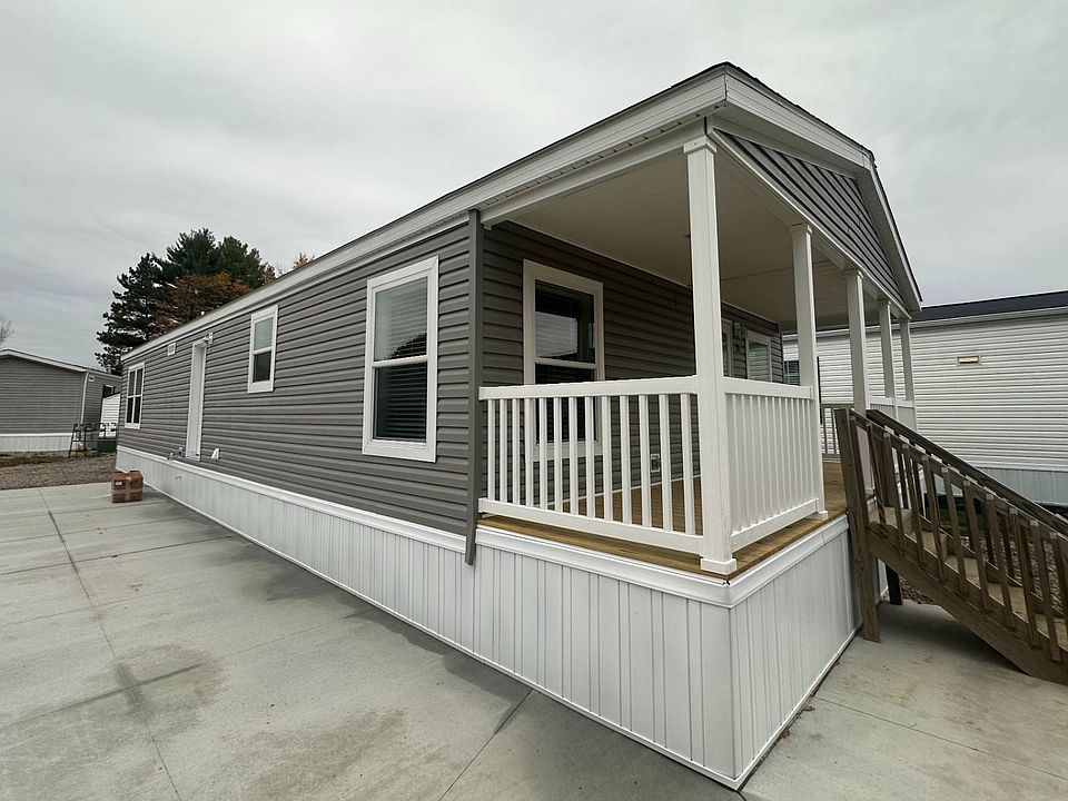 Welcome to your brand-new home. This double wide home is on a PRIME lot facing the woods and is extra wide. Imagine drinking coffee on this full front porch as you enjoy the wildlife! As you walk into the home from your front porch, you are greeted with a flood of light streaming in, along with a warm fireplace, complete with bookshelves flanking either side. The cook's kitchen comes with upgraded Whirlpool appliances and quartz countertops! A deep farm house sink sits beneath the kitchen window for even more light. Solid hardwood cabinets complete the kitchen and go all the way to ceiling for extra storage and no dusting! The kitchen is further highlighted by a custom coffee bar and dining nook, butcherblock island, AND a huge pantry cabinet! Laundry room has an extra outlet for your freezer and more storage. Down the hall you will find three spacious bedrooms, and a primary suite with a glamour bath that includes a walk-in tiled shower, rain head showerhead, more privacy windows, a LED lighted mirror, raised china sink, and even more storage. Luxuriate in the giant soaking tub. Guest bath boasts one piece fiberglass tub/shower combo, with a transom window in the shower, and an LED lighted mirror, and comfort height toilet. Outside you'll find a faucet on the driveway side, along with three exterior outlets for all your needs (including one in the soffit for holiday lights!) Not to mention this drywall home (no vinyl panels!) has upgraded insulation, Tyvek wrap, energy efficient windows, and ice guard on the roof to keep you comfortable in any season. Included are AC and two sets of custom built steps. Did we mention?......, we include the lawn cutting, so no work for you!