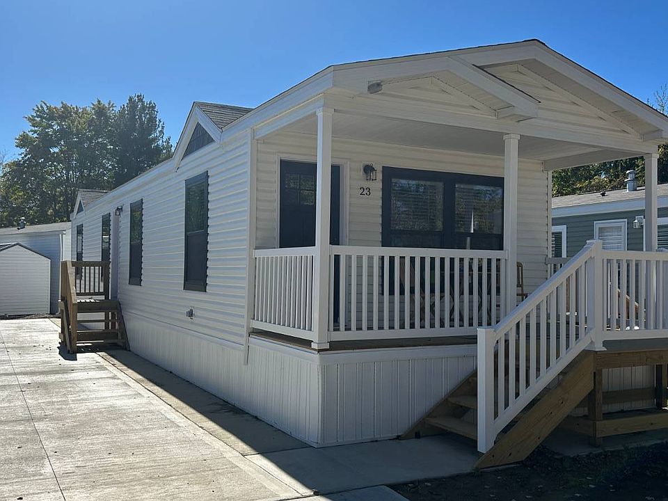 Come enjoy your new home! Our 55 and over community offers ranch style homes with energy efficient gas heat, and spacious front porches on all the homes! This home (on a premium lot!) is move in ready- boasting a spacious kitchen with loads of cabinets, all Whirlpool, stainless steel appliances, and a large farmhouse style sink, with a unique waterfall feature and glass rinsing. All the rooms are flooded with light, there are even transom windows in the bathrooms. Easy care vinyl through the common areas of home and cozy carpeting in the bedrooms. Primary bedroom also has a walk in closet for even more storage. Our homes are super energy efficient with added insulation in the roof, walls, and floors, along with Tyvek wrap, tape and foam windows, and ice guard on the roof. Also, included in your purchase is central air conditioning and gutters. And two sets of custom-made wood steps. We've added lots of little extras for you including hardwood kitchen cabinets that go to the ceiling, comfort height toilets in bathrooms, along with grab bars, outside faucet on driveway side for car washing, along with three exterior GFIs - including one in the front porch eave for hanging lights. Not to mention entire house is drywall, NOT vinyl panels. AND, this home has gutters included, along with an extra long cement driveway to accommodate two vehicles! Sheds and carports can be added at additional expense.