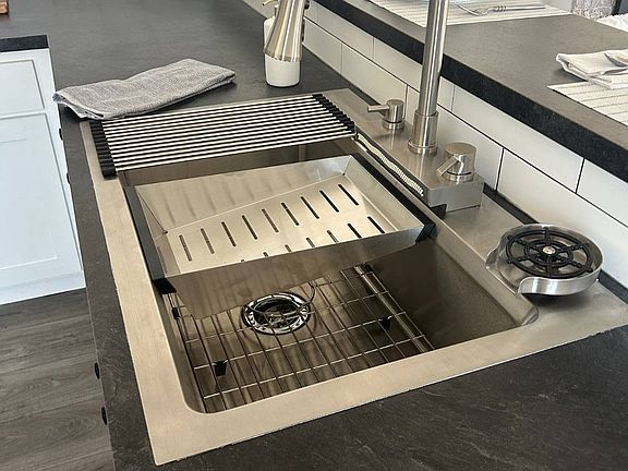 Large farmhouse style sinkSpacious front porchesStainless steel appliancesGrab barsLoads of cabinetsExtra long cement drivewayUnique waterfall feature