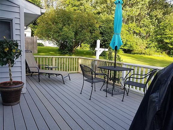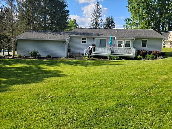 Main level offers an open layout Kitchen, Dining area, and Living Room. Large, bright eat-in Kitchen with new flooring, Granite counters, & stainless steel appliances. Ample sized living room with picture window. Bedroom wing features three bedrooms, highlighted by Primary Suite with full bath offering Jetted Tub, walk-in shower, and double vanity. Main level rounded out by tastefully upgraded full Guest Bathroom. Clean, dry basement space - very usable as-is, or finish to your liking. Some recent upgrades include paved driveway with turnaround, new electrical service box, propane furnace, Central AC, new garage door, sliding glass door and many vinyl replacement windows. Exterior highlighted by great setback from the road, large level backyard, Trex deck. Great House, Great Location!