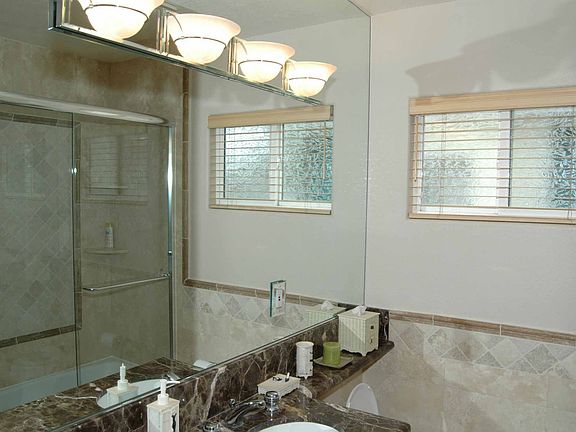 Fantastic one of a kind home. Extensively remodeled with glossy hardwood floors, ceramic tile, and travertine. Kitchen with built-ins sub zero refrigerator). Master suite with spa tub, fireplace, steam shower, walk in closet, and sliding glass doors to patio. Three other large bedrooms and three baths. Huge living room. All double pane windows and mahogony doors. Beatifully landscaped and hardscaped. Custom driveway pavers. Central air & heat. Drywalled garage/pull down storage. Concrete roof.