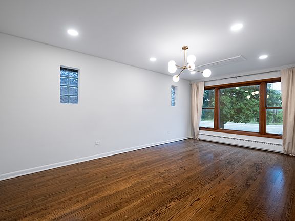 Beautiful and bright updated brick home in the heart of Forest Glen. This home has undergone a major transformation-be the first to rent this freshly renovated space featuring thoughtful updates, abundant natural light, and a fantastic location. The main level offers a spacious living and dining area with refinished hardwood floors throughout, recessed lighting, and a large picture window that fills the space with sunlight. The layout includes plenty of room for a full dining area, anchored by a new modern light fixture and located just off the fully updated kitchen. The newly renovated kitchen features GE stainless steel appliances, white upper and green lower cabinets, quartz countertops, subway tile backsplash, and modern brass hardware. Three comfortable bedrooms offer good closet space and clean, neutral finishes. The home includes an updated full bath and a convenient half bath, both with new vanities, toilets, and fixtures. Additional upgrades include new windows, new lighting throughout, ceiling-mounted heat pump AC units, and a large unfinished basement with laundry and plenty of storage space. Enjoy parking for up to 3 cars on your gravel parking pad. Located across from LaBagh Woods and the North Branch Trail, and just blocks from the Forest Glen Metra, I-94, and local shopping, with easy access to parks and transit and more. Tenant pays utilities. Available now.