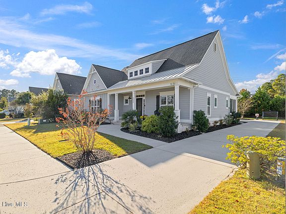 Situated in the gated community of Helms Port, this beautifully maintained 3 bedroom, 3.5 bathroom home offers 2,295 sq ft of primarily first-floor living and an unmatched coastal lifestyle. Helms Port sits along the Intracoastal Waterway and features amenities galore, including a resort-style saltwater pool overlooking the private marina, a private community beach, large clubhouse, kayak storage and launch, fire pit area, and sidewalks throughout the neighborhood. Built in 2016 and meticulously cared for, this home greets you with undeniable curb appeal—complete with a rocking-chair front porch and a rear side-entry two-car garage. Inside, high-end finishes and thoughtful details shine, including 10-foot ceilings, plantation shutters, reverse osmosis in the kitchen, tankless water heater, and more. A welcoming foyer opens to a flex room with French doors on the right and the spacious primary suite on the left. The primary bedroom features tray ceilings and an elegant ensuite bathroom with dual vanities, a large tiled walk-in shower with a built-in seat, a private water closet, and an impressive walk-in closet with wood shelving. An additional first-floor bedroom also offers its own ensuite bathroom with a tiled tub/shower combo. The heart of the home is the open-concept living space. The gourmet kitchen overlooks the living and dining rooms and includes a gas cooktop, built-in microwave, double wall ovens, subway tile backsplash, granite countertops, and a generous island with seating. The living room features tray ceilings, a gas-log fireplace framed by built-ins, and stylish shiplap accents. Off the living room, a heated and cooled sunroom provides a serene year-round retreat. A laundry room and half bath round out the first floor. Upstairs, a private guest suite with its own full bathroom offers the perfect space for visitors. A showstopper both inside and out, this home truly has it all and the incredible Helms Port community lifestyle is the cherry on top!