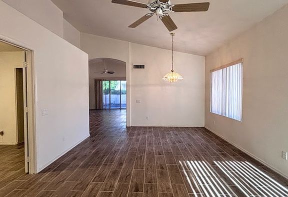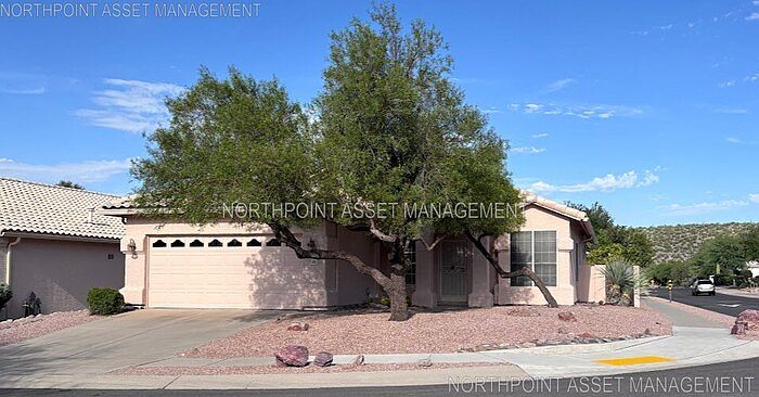 Split bedroom floorplan with new wood look ceramic tile. Separate living/dining area combo and spacious family room with gas fireplace and kitchen equipped with all appliances, breakfast nook, pantry. and new granite countertops. The large sliding doors open to a spectacular patio with mountain views and easy to maintain private yard. The large primary suite has a large bathroom with a garden tub and separate shower, large double sink vanity and spacious closet. There are 3 other bedrooms, the first is located off the living area that could be an office, the other bedrooms are located off the hall next to the guest bathroom and laundry room with full size washer and dryer included. There is a two car garage with built in cabinets for extra storage and front yard landscaping is included.