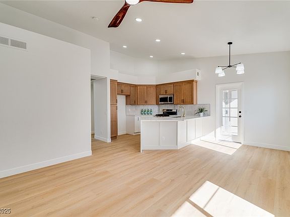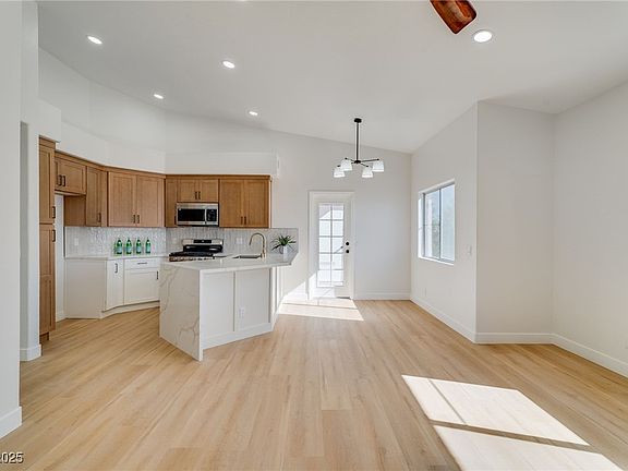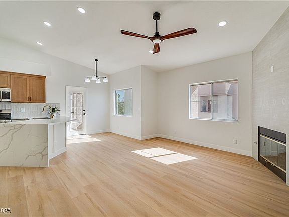 Terrific Fully Remodeled southwest condo in well-maintained gated community! This desirable upstairs unit features vaulted ceilings, brand new cabinets, countertops, flooring, baseboards, appliances, and both bathrooms! The spacious primary bedroom has a ceiling fan, walk-in closet and slider out to the balcony. Great open flowing floor plan. A short walk to the sparkling pool and spa. Super convenient to the 215 Beltway, I-15, amenities, shopping, transportation, Allegiant Stadium and 2 miles to the Las Vegas Strip! Great value!