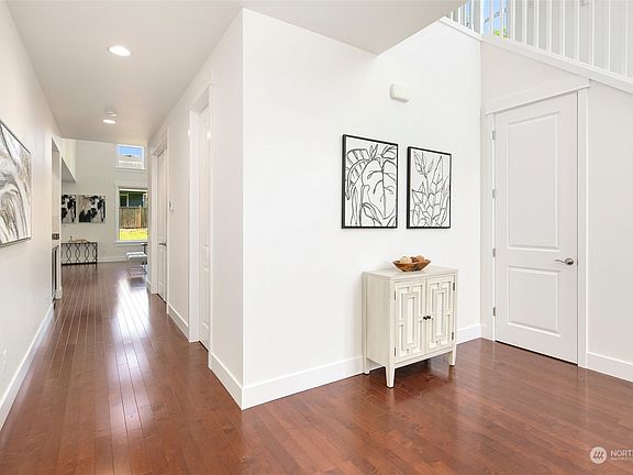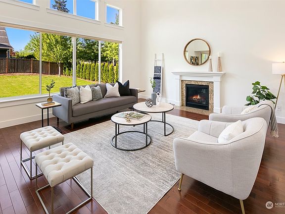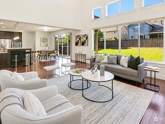 Stunning Beclan Place home w/9' vaulted ceilings, hardwood flooring, new carpeting, fresh paint throughout, floor to ceiling windows bringing in natural light & high end finishes. Open concept living w/an amazing chef's kitchen w/gorgeous granite countertops/beautiful cabinetry, ss appls - opened to living/dining room w/cozy fireplace. Slider to outdoors where you will enjoy a covered deck, fully fenced yard. Main level flex room is prewired for surround sound! A perfect media room or office. Upstairs is a loft overlooking the main level w/a wet bar. Primary bd has plenty of closet space, 5 piece bath w/soaking tub & 600 sq ft deck! 3 more large bds & another full bath on upper level. 3 car garage, A/C & minutes from The Landing in Renton!