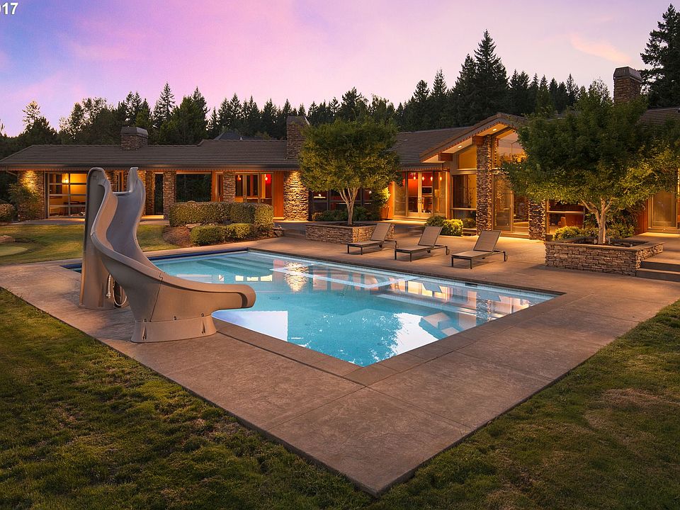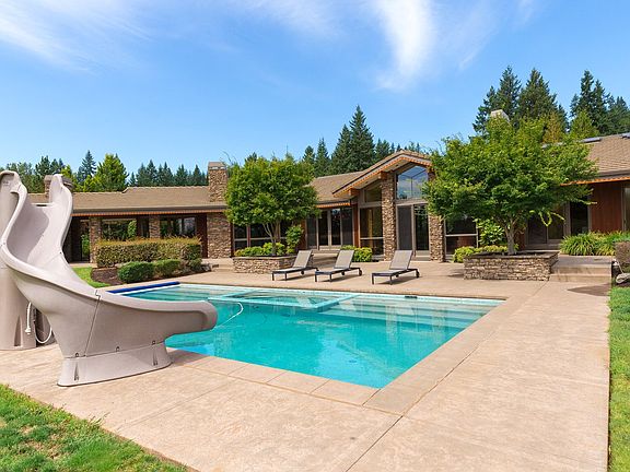 Beautiful single-story, 5,884 sq. foot, North Wilsonville home on 6 acres with 5 beds/5.5baths. Frank Lloyd Wright/1960s ranch-inspired Street of Dreams home with stone & wood elements throughout. Pool, sport court, putting green & soccer pitch in private backyard. Floor to ceiling windows, vaulted ceilings & exposed beams in flowing, open spaces. Gourmet fully-appointed kitchen with pro appliances & great outdoor entertaining space.