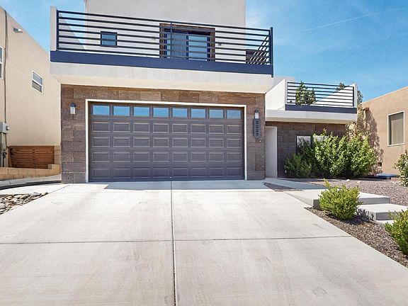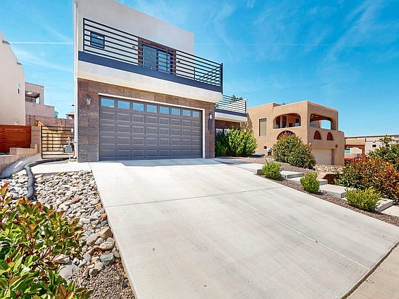 Elevated above the city, panoramic views of the Sandia Mountains, Bosque and glittering skyline.This exceptional 5 BDRM / 4 BTH custom home offers spacious comfort with four-season beauty. Ideal for multi-generational living, thoughtful layout includes soaring ceilings, 8' doors, custom lighting, TWO Laundry areas, flexible office or 5th bedroom. Chef's kitchen, premium appliances, generous pantry, hidden micro. elegant custom tile, flowing into an oversized island, dining & living areas. Private guest suite has direct backyard access. Upstairs, loft & primary suite open to separate balconies with panoramic eastern views. Outside, enjoy a private low-maintenance yard, covered patio, a therapy pool just perfect for relaxing & entertaining. Finished 2-car garage in a desirable neighborhood!
