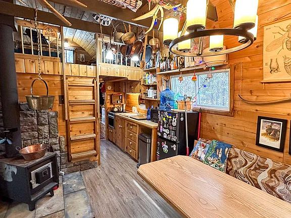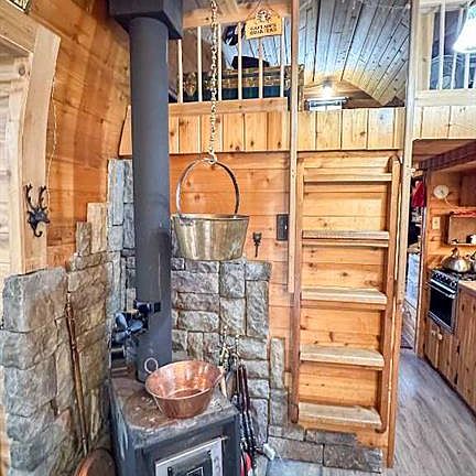 Private forested lotMature treesLush vegetationRustic interiorWarm wood finishesCozy wood stoveWell-equipped galley kitchen