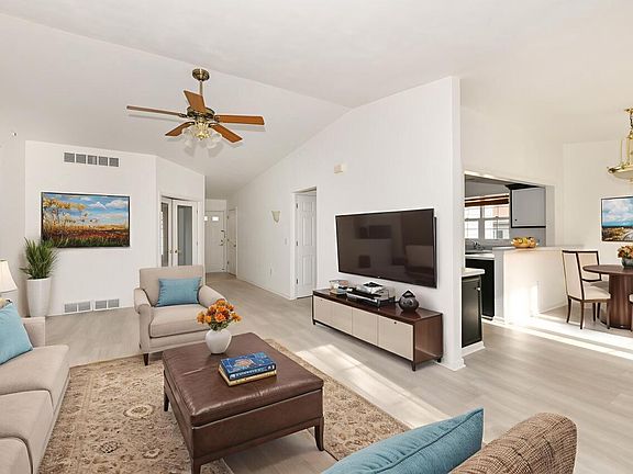 This inviting 2-bedroom, 2-bathroom condo offers comfort, convenience, and style. Inside, you'll find all new flooring throughout and a bright, open layout. The kitchen features new appliances, a convenient breakfast bar, perfect for casual dining or entertainment. Living room boasts vaulted ceilings and a gas fireplace, creating a warm and inviting space with patio doors. The spacious primary bedroom includes a walk-in closet and en suite bathroom. Main floor laundry adds ease to everyday living. An unfinished basement provides plenty of storage or the opportunity to create additional living space. This end-unit location provides extra privacy and natural light, making it a wonderful place to call home. Some photos are virtually staged. Home warranty included!