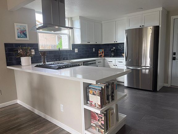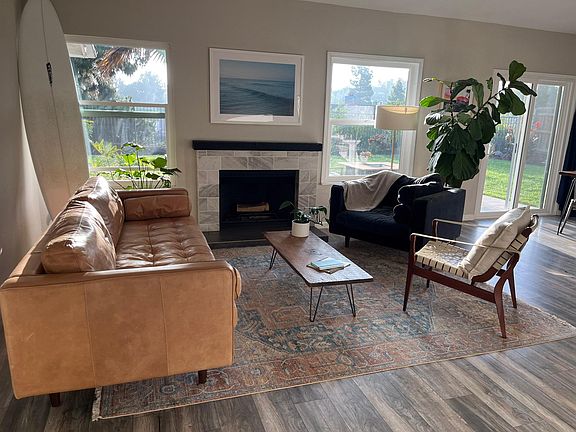 Beautiful, fully-remodeled three-bedroom home in quiet Oceanside neighborhood. Sunlight fills the captivating, open-concept living room, dining room, and kitchen. Wood laminate flooring throughout, gas fireplace, and thoughtful upgrades, such as built-in bookcases. Fully-updated kitchen with stainless steel appliances, slate tile floors, beautiful blue tile backsplash, and upgraded quartz countertop. Kitchen nook works well for home office or additional dining area. New, whisper-quiet dishwasher; refrigerator, microwave, and gas stove all included. Primary bedroom has vaulted ceilings, an upgraded en suite bathroom, two full-size closets with mirrored doors, and views of Big Bear and the foothills in the distance. Easily fits a king-size bed and dressers. Two additional bedrooms have closets with mirrored doors. Enjoy territorial views from the expansive, fully-landscaped backyard. Entertain on the back patio. Organic garden with mature citrus trees. Xeriscaped, low-maintenance front yard. (Gardener included) Two-car garage with shelving. Washer/dryer hookups. Greenspace across the street creates tranquility and privacy. Enjoy picturesque Guajome Park nature preserve just a few blocks away. 15-minute drive to Oceanside Pier and beaches. Bedroom Dimensions: Primary Bedroom: 11 x 14 Bedroom 2: 10 x 12 Bedroom 3 / Office: 9 x 10 Gardener included. Tenant pays all utilities. Deposit and first month's rent due at signing. No smoking inside. One-year lease.