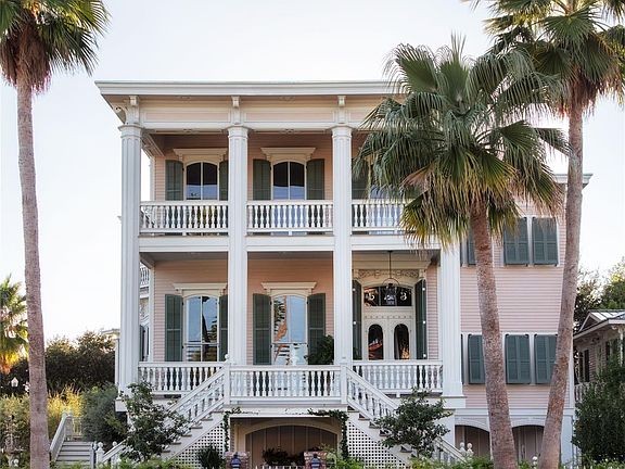 Built in 1874 by Robert J. Hughes, this unparalleled, Italianate Victorian estate sits on a prominent corner lot in Galveston's East End Historic District. spanning 5,500 sq ft on a 10,280 sq ft lot, the property includes five elegantly appointed suites in the main home and a breathtaking, whimsical suite in the carriage house. With meticulous ad thoughtful design by Alayna Louise Interiors, the property maintains architectural integrity, while introducing layered interiors, such as Brunschwig & Fils drapery, Schumacher and Quadrille wallpapers, antique European chandeliers, along with a lifetime collection of exquisite antique furnishings some of which may convey. The unique kitchen is artfully designed with powder-coated steel cabinetry and a marble-clad island. Lush gardens and a serene pool complete this rare, turnkey offering-a historical legacy all wrapped up into a once-in-a-lifetime offering.