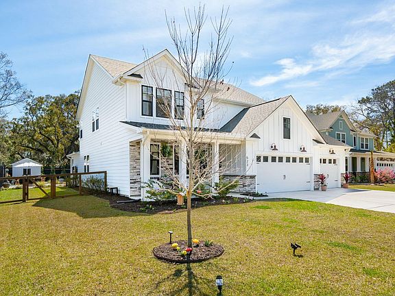 Welcome to 523 Coaxum Road, a thoughtfully designed and extensively upgraded home in the heart of Mount Pleasant. From the moment you arrive, the cement plank siding, stone accents, 3 car wide driveway and inviting front porch set the stage for the charm and quality found throughout this home. Built by Rock the Block Charleston builder Hunter Quinn and HERS Certified with an impressive score of 59, this home combines energy efficiency, modern elegance, and functional design--all on a spacious lot with no HOA fee and plenty of room for a pool.Step inside to find an inviting foyer that sets the stage for the home's impeccable craftsmanship. To the left, a dedicated office/study with French doors and built-in cabinet storage provides the perfect workspace. On the right, a well-appointed laundry room with an additional sink offers direct access to the oversized three-car garage, which includes an extra-deep parking space, workshop space, and a dedicated circuit for an potential EV charger. The powder room is conveniently located just off the foyer, and three separate closets including a spacious under-the-stairs storage area offer exceptional organization. Beyond the foyer, the gourmet kitchen boasts custom-built pantry storage, quartz countertops, a gas range, high-end stainless steel appliances, a custom tile backsplash, and an oversized island ideal for entertaining. Adjacent to the kitchen, the dining area is bathed in natural light, while the spacious living room is highlighted by a stunning Roman Clay fireplace façade with a locally sourced Edisto River reclaimed wood mantle. Just past the kitchen, the primary suite offers two walk-in closets with built-in organization and an additional hall closet plumbed for a morning kitchen. The luxurious ensuite bathroom features a freestanding soaking tub, a frameless glass walk-in shower, dual vanities, and elegant tile work. Upstairs, a large loft/flex space features durable laminate flooring offering endless possibilities. To the left, two generously sized bedrooms share a Jack-and-Jill bathroom, while two additional bedrooms and another full bathroom are located to the right. All upstairs bedrooms are outfitted with smart fans with integrated lighting. The entire home is designed for comfort with sound-dampening insulation in walls around all bedrooms. The outdoor living space is just as impressive. A spacious screened-in porch leads to a large marble tile patio, perfect for entertaining. The fully fenced-in yard features an 8-foot privacy fence, a custom-built 10'x12' storage shed, a dedicated dog wash station, and a custom-built playset. The home's irrigation system keeps the landscaping lush, while a rain barrel is integrated into the gutter system for added sustainability. Additional high-performance upgrades include fully owned solar panels that generate free energy and offer selling excess energy back to Berkeley Electric. The home is also equipped with hurricane panels for all lower windows and hardware for all windows, a spray-foam insulated attic, and a conditioned attic storage space. Located just 2 minutes from I-526 and 13 minutes to Isle of Palms, this home offers the perfect blend of curb appeal, efficiency, and comfort. With no HOA, ample storage, and a prime Mount Pleasant location, this is a rare opportunity to own a truly exceptional home.