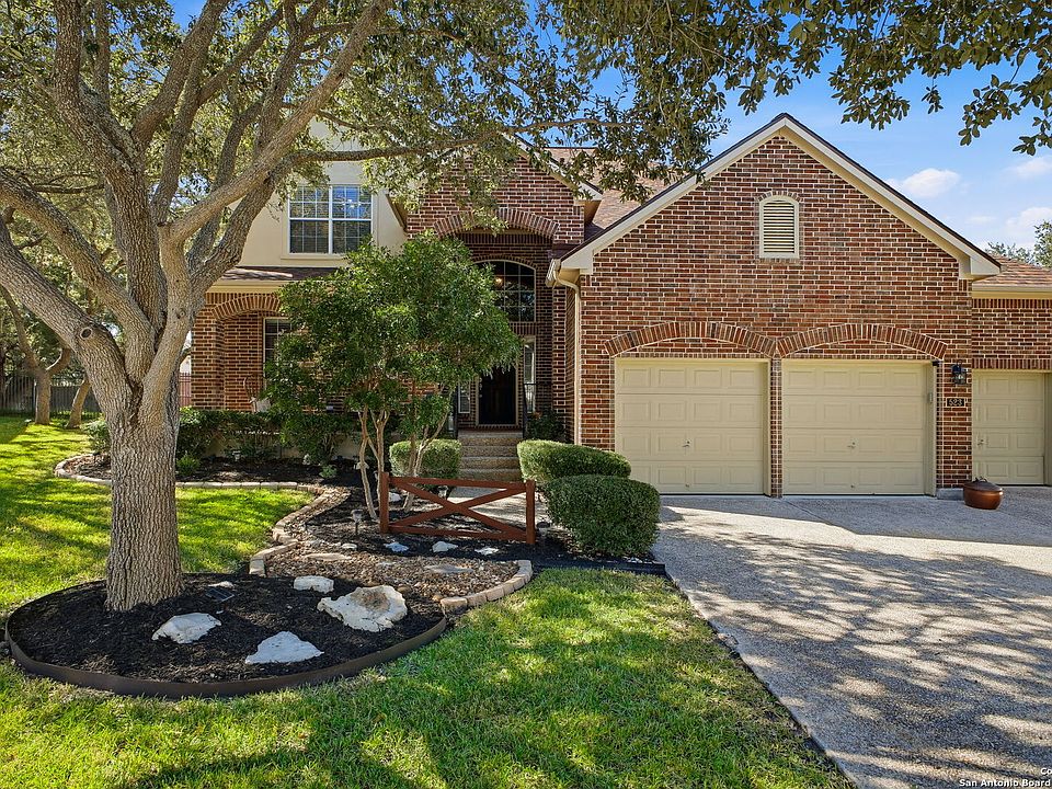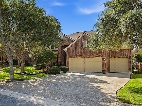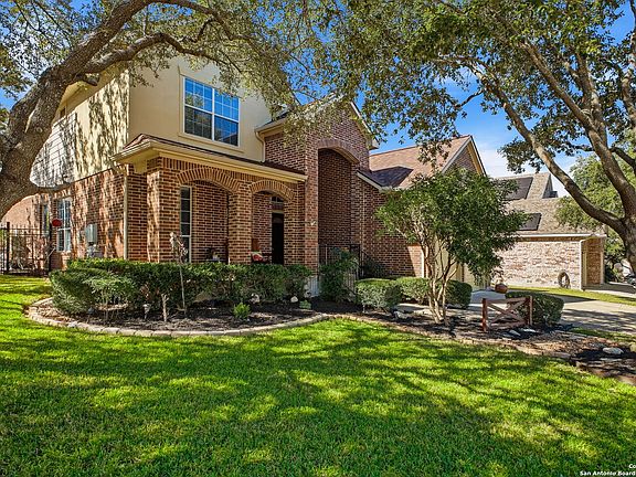** OPEN HOUSE THIS SAT 11/15 10 AM - 12 PM ** Beautifully updated 2-story brick & stucco home on a large cul-de-sac lot in the guard-gated Heights at Stone Oak. Backyard retreat features a heated Keith Zars pool & spa with new tile surround, new heater, LED lighting, firepit, flagstone patios & plenty of grassy space. Inside you'll find soaring ceilings, hardwood floors, crown molding, stone fireplace, 2 living & 2 dining areas, plus a cozy sunroom overlooking the pool. Chef's kitchen offers granite counters, gas cooking, double ovens, walk-in pantry & fridge conveys. Primary suite down w/ new floors, jetted tub, sep shower, dual sink vanity & custom walk-in closet w/ LED lighting. Upstairs: 3 bedrooms, 2 baths (Jack & Jill), game room & walk-in attic. 3-car garage, new roof (2024), recent HVAC w/ UV ionizer, water softener, 2 WHs, sprinkler, solar screens. Mins to H-E-B & close to 281/1604, NEISD schools, dining & shopping.