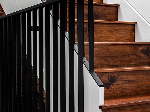 Enter the first floor to find an open floor plan with custom features almost everywhere you look. Madera Trade character black walnut floors create the perfect industrial complement to black finishes and modern fixtures. A spectacular kitchen just off the living/dining space is outfitted with state-of-the-art black steel appliances, like a Summit wine cooler and Subzero Wolf wall oven, gas range, and refrigerator. The massive custom kitchen island offers breakfast seating.