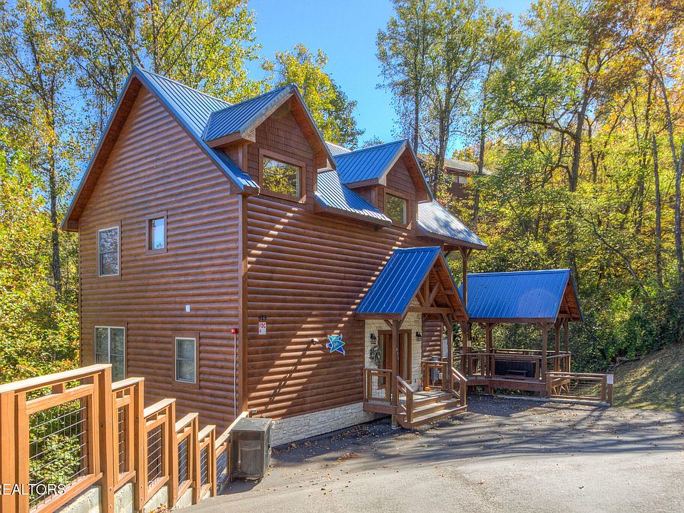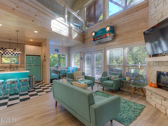 Soak in the nostalgia at ''Happy Days'', an almost new 50's-themed cabin in the heart of Sevierville that offers a unique blend of vintage charm and modern amenities. The main level boasts a jaw-dropping great room appointed with a jukebox, fireplace, fully equipped kitchen with retro refrigerator, and a cozy booth straight out of a classic diner. You'll also find a luxurious suite on this level with a custom tile walk-in shower in its private bath, as well as a laundry closet with full-size front loading machines and a powder room serving the common area. This level also accesses the deck with covered areas for grilling & dining plus a hot tub gazebo for soaking in the peaceful wooded setting. Ascend to the upper level and discover a lovely open loft with sitting area, game table, a vinyl record player, and a desk with assorted games. The loft is completely surrounded by large windows, so you can enjoy the outdoors in any weather! This level is home to the ''Pink Ladies'' suite, complete with a luxury bath that offers both a custom tile shower and an elegant soaking tub. The lower level provides even more entertainment, with a pool table, theater room, and a bunkroom with bunk beds and an Xbox for gaming fun. In addition to the bunkroom's ensuite bath there is another powder room, plus a second deck for outdoor relaxing. Built in 2024, this distinctive home sports top-notch materials and construction for lower maintenance and even has a sprinkler system for guest safety, while the location provides easy access to the National Park, Skyland Ranch, Dollywood, Soaky Mountain Water Park, and Sevierville/Pigeon Forge/Gatlinburg via the Parkway. Such a unique property is sure to provide a memorable vacation experience and generate the return visits that lead to rental success, so request a showing soon to see if this is the right place for you!