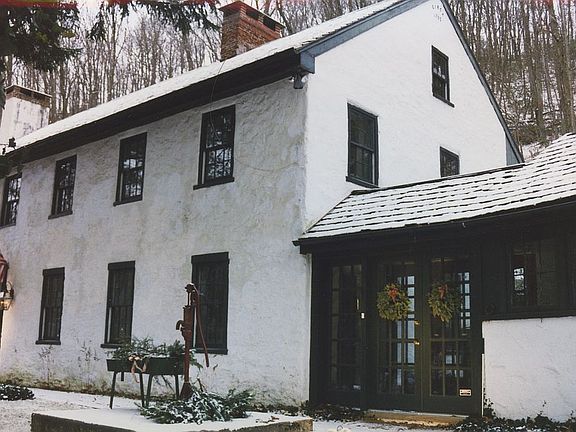 3 story stone/masonry cottage nestled on 10+ wooded acres with trail leading to last flat acres. View of trout stream on a winding country road. With origins in the 1790's it is fully renovated. Possible B&B or Airbnb. Brick and wide pine flooring. Rooms with wood beam ceilings. 3rd floor loft. 6 fireplaces; 1 gas stove and 1 wood stove. 2 floor workshop and studio in 2nd building. Gazebo. Walled courtyard. Potting shed. Stone steps around the house and throughout the perennial gardens. Woodland trail through property.