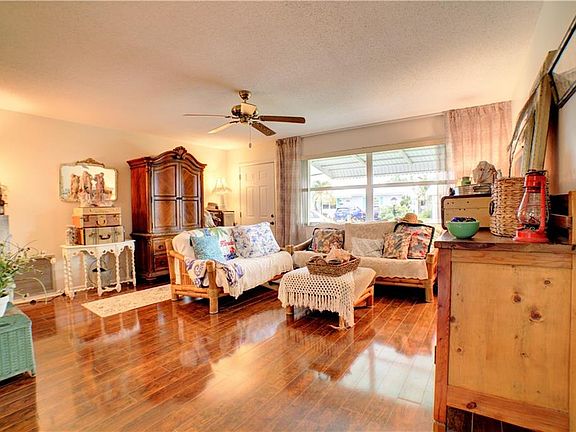 Enjoy the open kitchen, spacious living room, florida room, recently renovated dual bathtub/shower, bedrooms boasting large closets and acacia wood flooring throughout. The roof is approximately 3 yrs old and there are impact windows and doors throughout. The recreation lease has been paid.