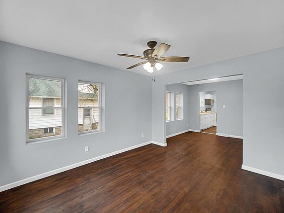 Modern light fixturesSleek laminate countertopsPlenty of natural lightRefinished hardwood floors