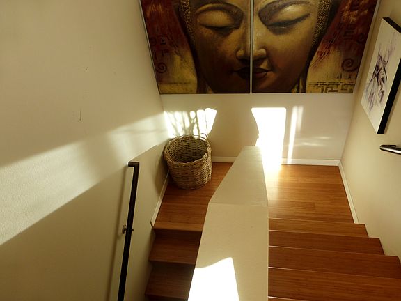Feng Shui home just a stroll to the Ocean Front. Enjoy an extra large lot with a stylish private-courtyard. Upon entering you will experience 10 ft ceilings, Travertine & Bamboo flooring and state of the art amenities. A Spacious 3150 sq ft floor plan offers a large living-room, dining and kitchen along with a downstairs bedroom, bath and bonus room/gym (rare for beach property). Custom Kitchen with Bamboo cabinetry and Bosch appliances. Second story offers a large master with a super size 2-person tub and Ritz like Travertine walk-in shower. Enjoy a private sunny deck with adjoining loft, as well as 2 bedrooms and full baths. Green Design: 2kw Solar electric, ultra high efficiency tankless water heater and forced air system. Functional, open floor plan with a modern flare along with warm traditional details.