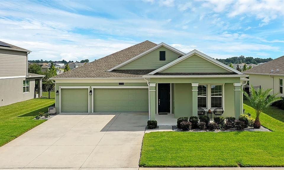 This charming single-story home offers 4 bedrooms, 3 bathrooms, and a 3-car garage. The gourmet kitchen is a chef’s dream, featuring 42-inch gray wood cabinets with crown molding, quartz countertops, stainless steel appliances, a stylish tile backsplash, counter seating at the center island, and a cozy breakfast nook. A formal dining room opens seamlessly to the spacious great room, complete with sliding doors that lead to a covered, screened lanai—perfect for entertaining. The primary suite boasts a luxurious en-suite bath with a large soaking tub, separate shower, double vanity, and linen closet. The highlight is the expansive walk-in closet with direct access to the laundry room for added convenience. The split-bedroom layout includes two bedrooms at the front of the home connected by a Jack & Jill bath, while the fourth bedroom sits just off the great room with its own full bath—ideal for guests or a private office. Meticulously maintained, this home also includes gutters, a water softener, and a termite bond for peace of mind. Located in a sought-after community with a 24-hour guarded gate, residents enjoy resort-style amenities including a pool with splash area, clubhouse with fitness center, tennis and basketball courts, and playground. Everyday conveniences are right outside the entrance with Publix nearby, while downtown Mount Dora’s charming shops and restaurants are just minutes away. Quick access to 429/417 makes commuting to Orlando and the attractions a breeze.