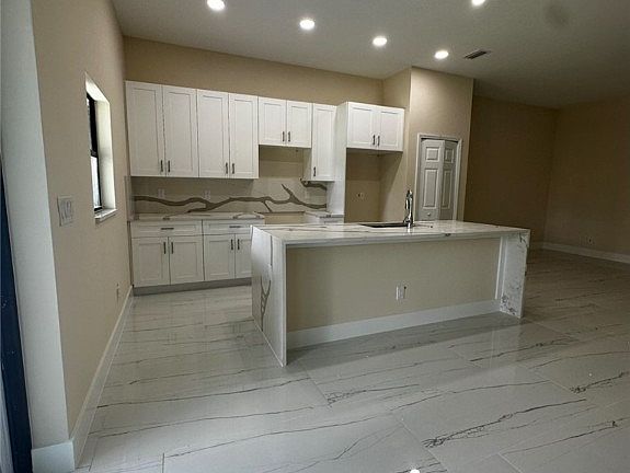 Kitchen: Modern white wood cabinets, All LED lights, a kitchen island with waterfall quartz countertops backsplash, and window sills