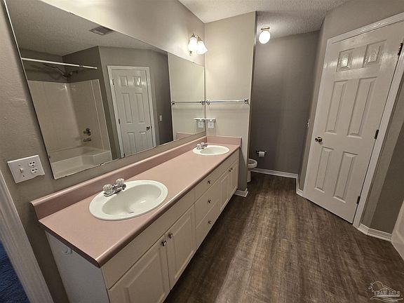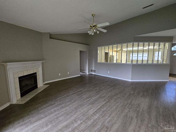 Come see this beautiful, all-brick home conveniently located in Pace. The living area features vaulted ceilings and a wood-burning fireplace. Sliding glass doors lead to a covered patio. This home has a split floor plan with three bedrooms along with a bonus room, which could function as the perfect playroom or office space. Vinyl flooring throughout the home with carpet in the bedrooms. The master bath has a double vanity and two walk-in closets. Large kitchen has an island, pantry, dining area, and access to the utility room. Not only does this home have a two-car garage, but it also boasts a double-wide driveway with ample parking space. Roof was replaced in 2023. Schedule your showing today!