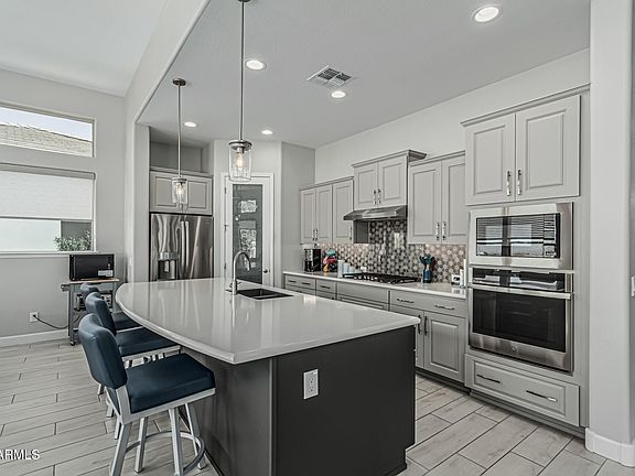 Find your ideal full or part time haven at the gated Victory in Verrado - Mountainside! Built by David Weekley, this spectacular home is sure to impress. Offering 3 beds, 3 baths and 2-car garage. The inviting interior boasts a contemporary feel, featuring modern finishes that create a warm and stylish ambiance including impressive 12' ceilings and transom windows in the spacious great room! Impeccable chef's kitchen has upgraded cabinetry, quartz counters, walk in pantry island w/bfast bar and high-end appliances w/gas cooktop & wall oven. Enter the main bedroom to find an ensuite with dual sinks, lg tiled shower & walk-in closet. Outdoor you have a covered & extended patio to relax or BBQ with gas firepit. Take advantage of resort-style community amenities of Mountainside and Victory