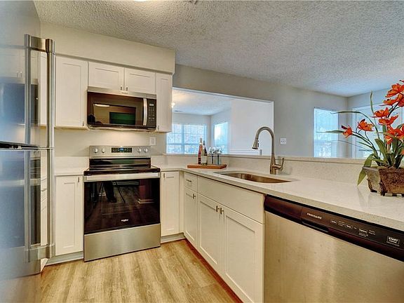 Beautifully renovated first floor unit with new flooring throughout, new soft close kitchen cabinets and quartz countertops with under mount sink, new Whirlpool stainless steel refrigerator, smooth surface electric range, microwave and dishwasher, new light fixtures and ceiling fans, new bathroom vanities, and new primary bath shower enclosure. Relaxing screened patio overlooking Honey Bee golf course. Corner unit with lots of natural light and a cozy wood burning fireplace in the living room. Two reserved parking spaces #138 and 145. Amenities include clubhouse, pool, playground and tennis courts. Call to see today!