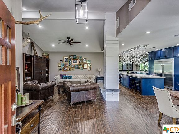 This beautiful home is situated on 2.87 acres, has tile throughout, a large open-concept dining and living room. The kitchen boasts a 16' x 5' concrete top island perfect for entertaining. Custom cabinetry and antique wood from 1892 are found in many spaces, along with a custom folding window allowing a seamless transition from the kitchen counter to the exterior bar top overlooking the oasis-style pool with a built-in fire pit. Each spacious bedroom contains its own private full bath and closets. There is also a second living room currently used as a full-size gym, a bonus room that could be utilized as a guest room, and a dedicated laundry/craft room. Located in an incredibly desirable area between Belton and Salado!!